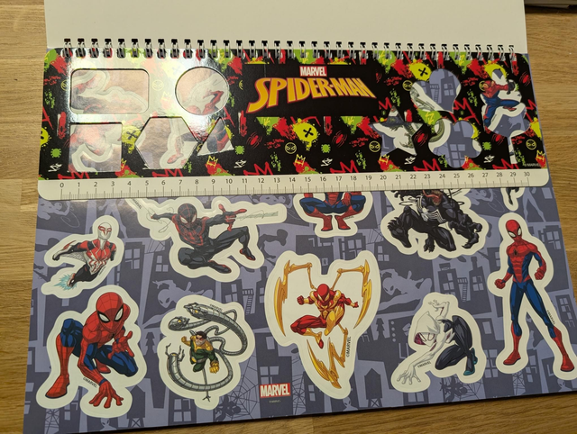 - 🎉 Première page : une planche de stickers Spiderman pour décorer cahiers, dessins et objets