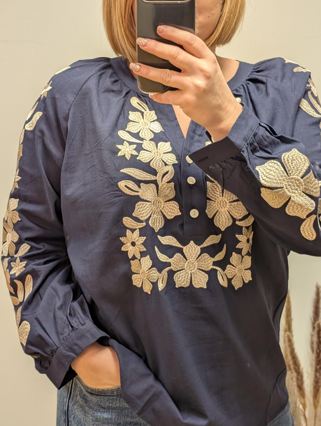 La sublime blouse Mathilde séduit par son coloris bleu marine intemporel, rehaussé de broderies délicates dans des tons beige irisé. Raffinée et lumineuse, elle apporte une touche d’élégance tout en restant résolument tendance.