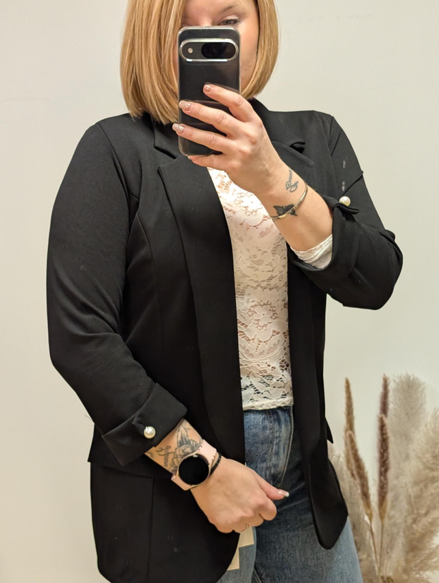Les manches 3/4 sont sublimées par une finition perle nacrée, détail délicat qui fait toute la différence. Grâce à sa taille unique, il convient parfaitement du 34 au 40. Un blazer élégant et facile à porter, aussi bien au quotidien qu’en occasion plus habillée.