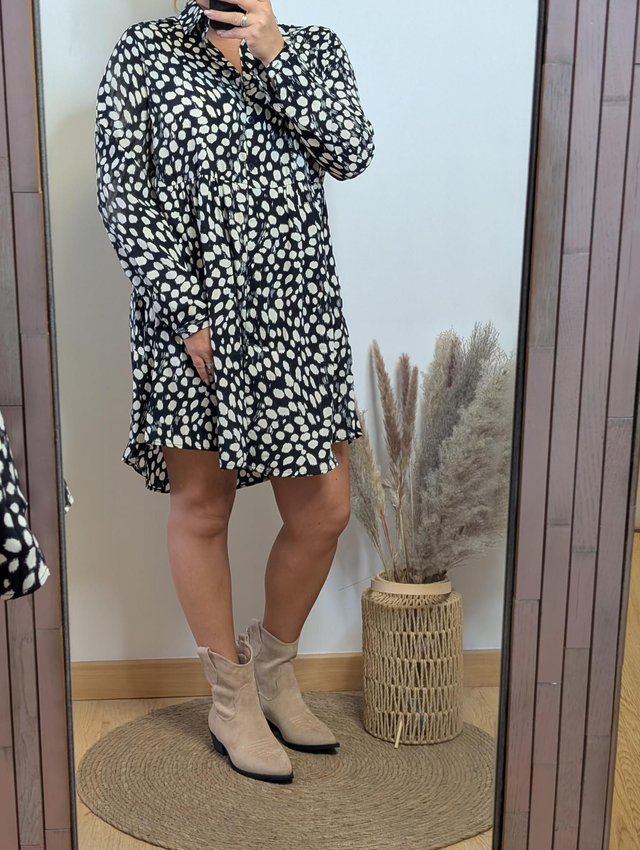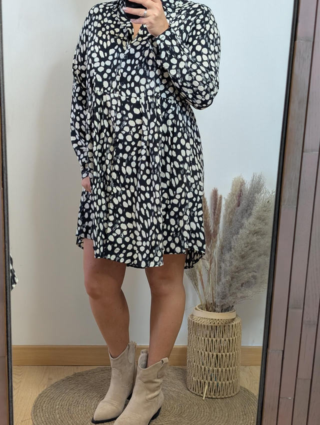 Craquez pour la robe Ina, une pièce fluide et légère, parfaite pour la mi-saison. Avec son motif délicat agrémenté de petites touches dorées, elle apporte élégance et modernité à votre tenue.