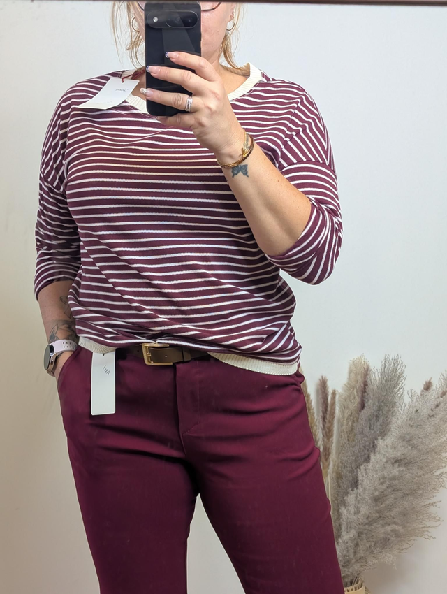 Adoptez un look estival et chic avec le Top Diane ! Son motif marin intemporel et son col esprit bateau lui confÚrent une allure élégante et décontractée à la fois.